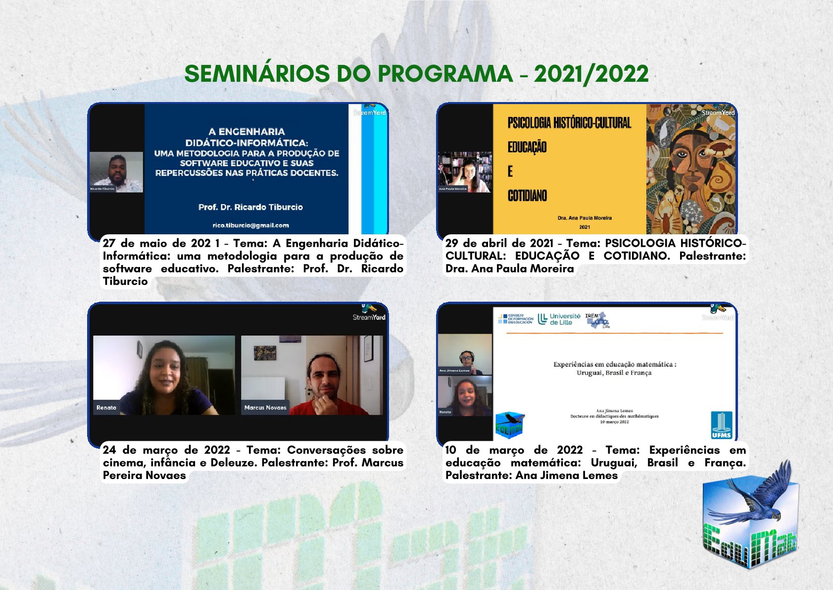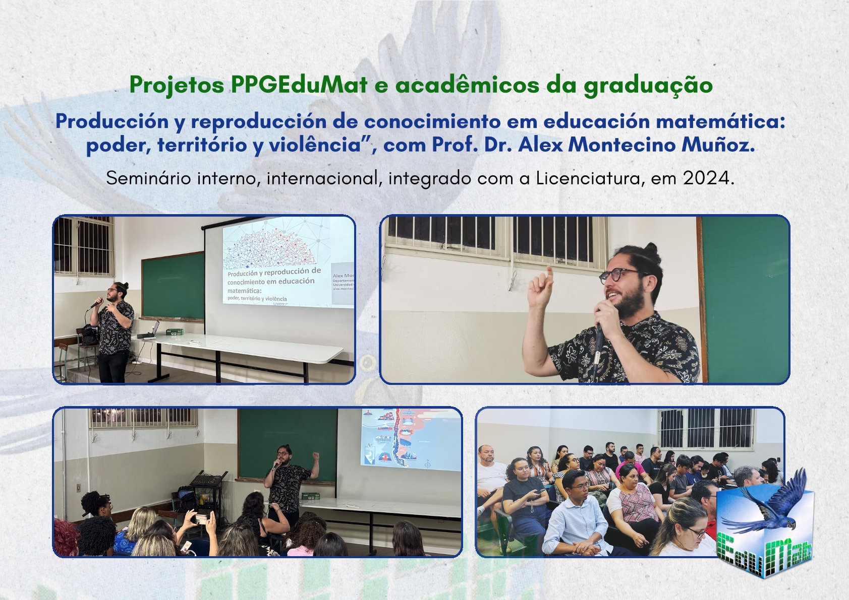 No PPGEDUMAT, desde sua criação, temos esta ação como permanente, ora aproveitando visitas de pesquisadores nacionais e estrangeiros, ora em tentativas de estabelecer diálogos mais próximos com pesquisadores de nosso estado e mesmo de nossa universidade.