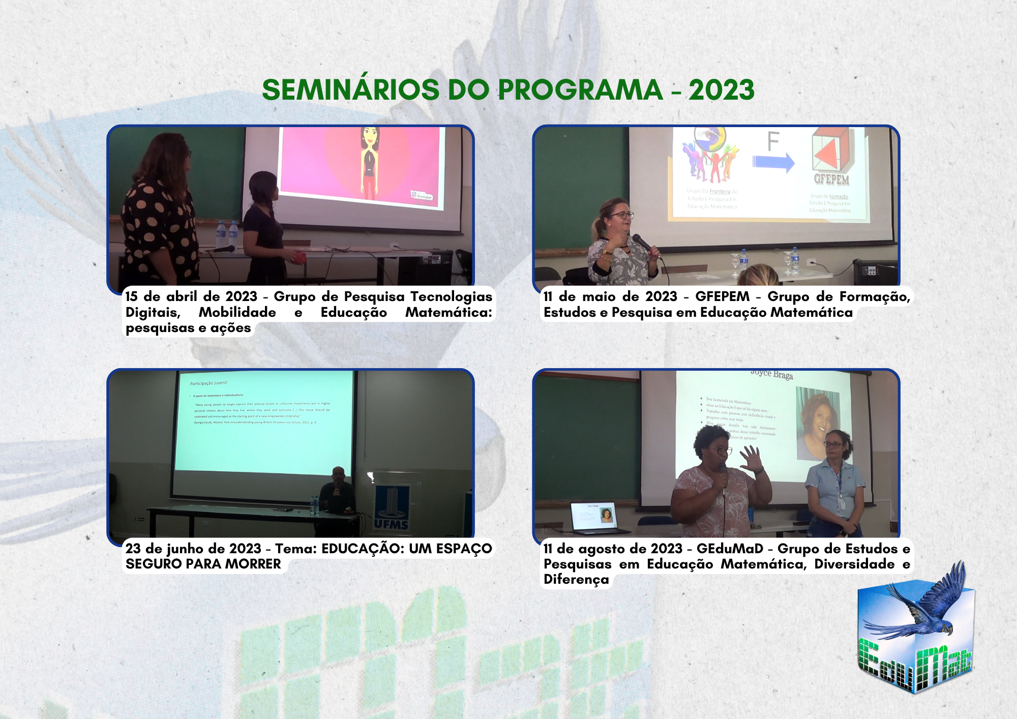 Os seminários de Pesquisa do PPGEDUMAT se constituem como um espaço de discussão, partilha e produção de conhecimento na área de Educação Matemática. Eles aglutinam todos os membros do programa ao redor de temáticas emergentes e contemporâneas, que acontecem de maneira contingente no dia a dia de docentes e discentes.
