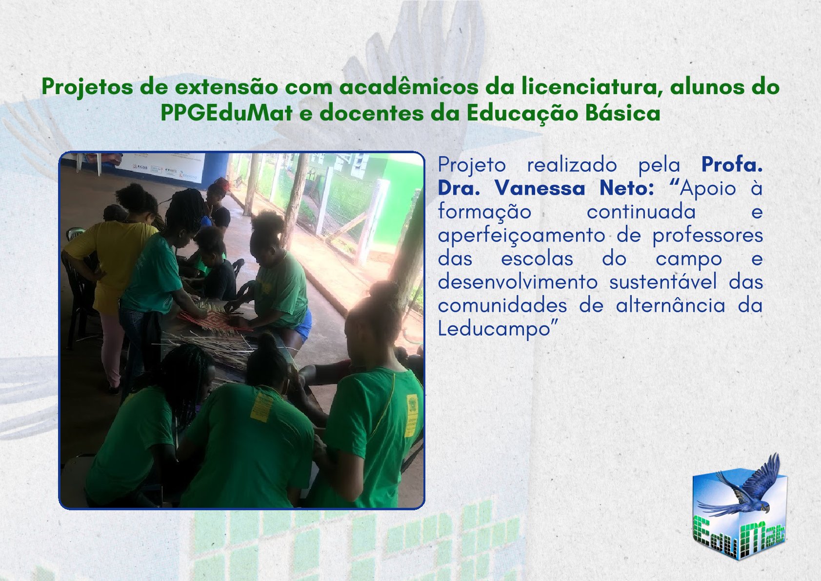 Projetos de Extensão com Acadêmicos da Licenciatura, alunos do programa e docentes da Educação Básica: “Apoio à formação continuada e aperfeiçoamento de professores das escolas do campo e desenvolvimento sustentável das comunidades de alternância da LEDUCAMPO”